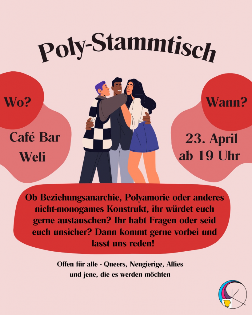 Ob Beziehungsanarchie, Polyamorie oder anderes nicht-monogames Konstrukt…Ihr würdet euch gerne austauschen? Ihr habt Fragen oder seid euch unsicher, ob poly sein etwas für euch ist? Dann kommt gerne vorbei und lasst uns reden! Alle sind willkommen, egal, wie queer ihr seid, ganz unabhängig von Labels und Zugehörigkeiten!